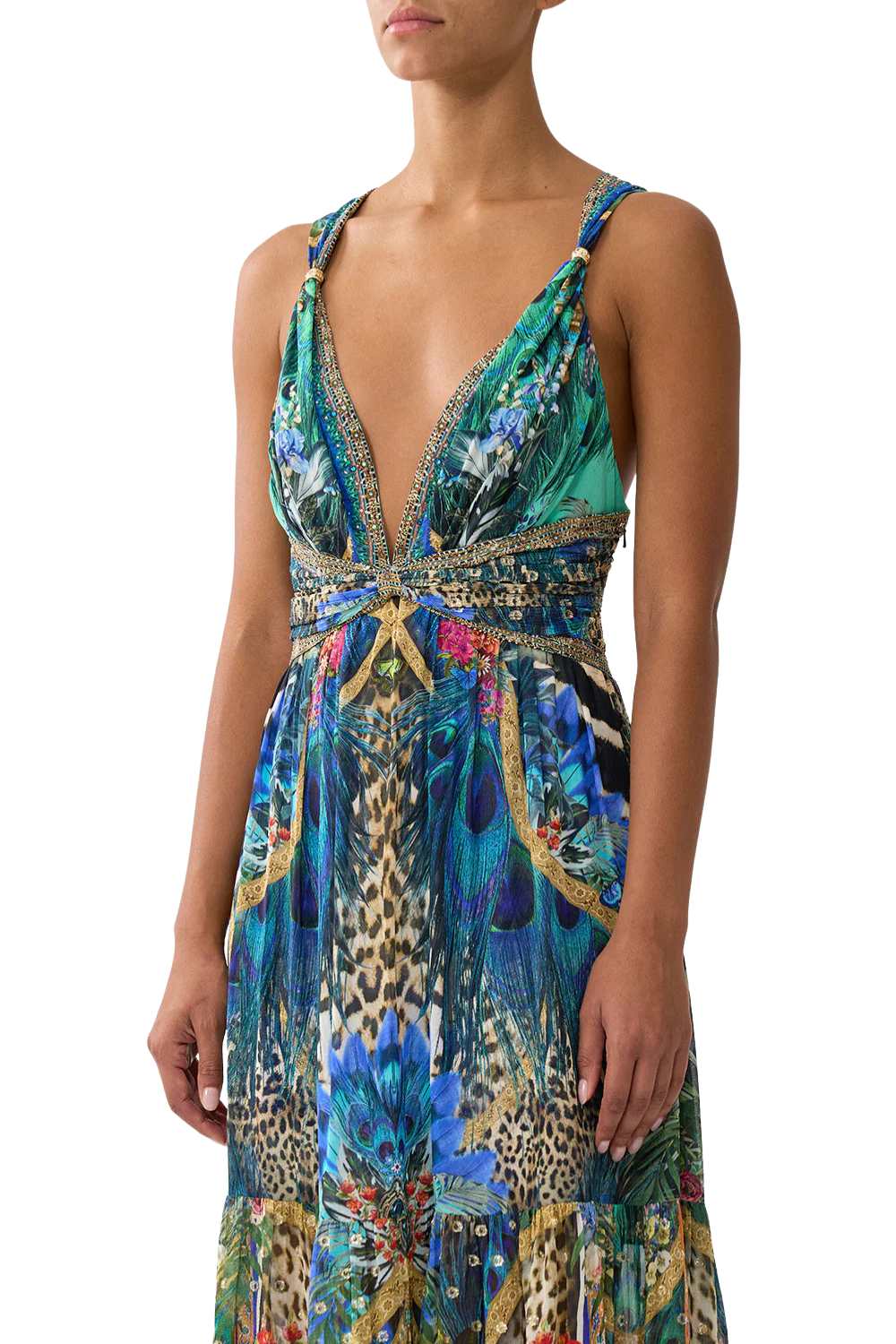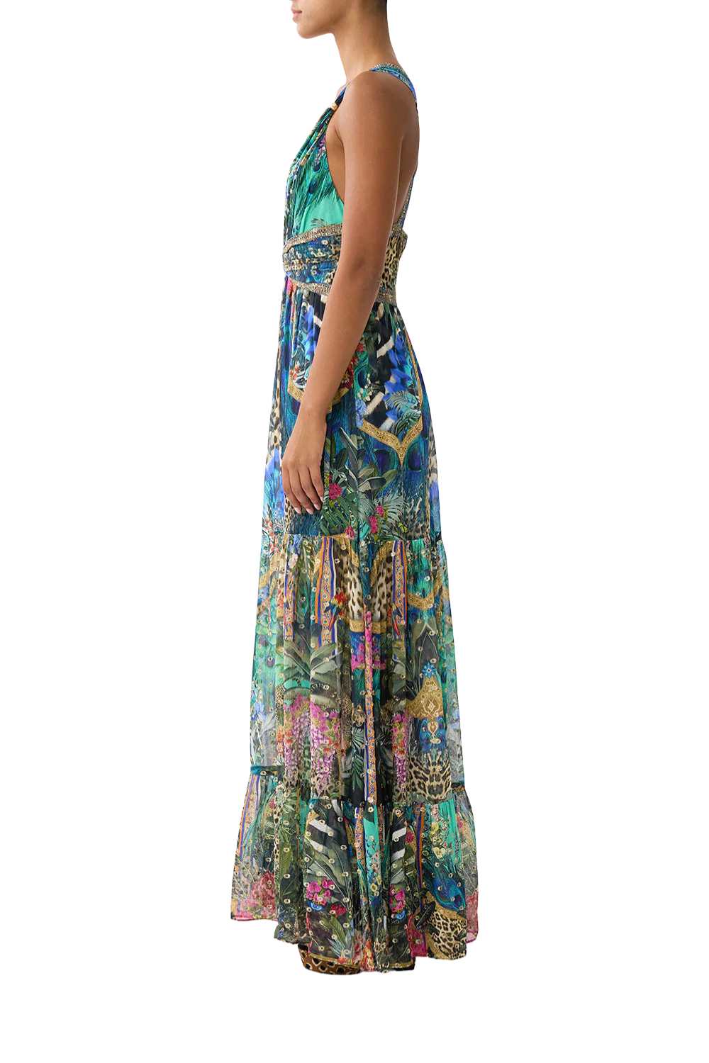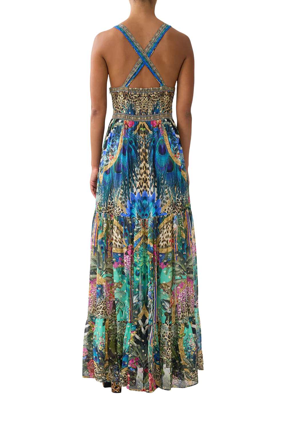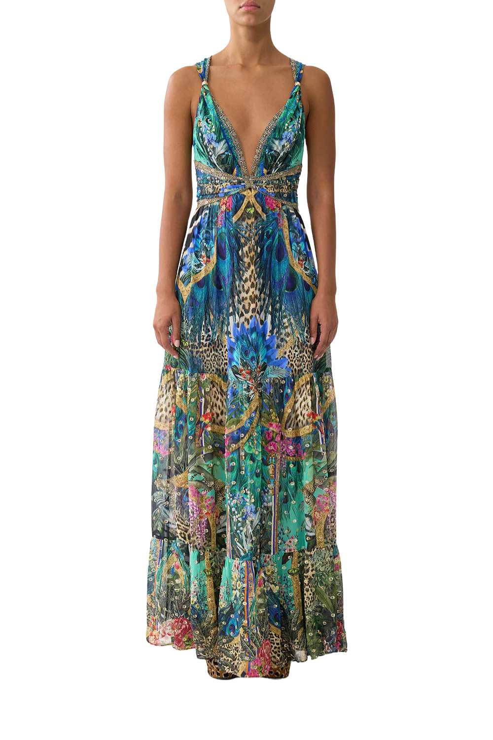Wildly elegant, Camilla Animal Alchemy Panel Dress is a handcrafted maxi silhouette in a striking limited-edition print. Featuring a plunging neckline and softly gathered paneled skirt, it’s elevated with beaded hardware straps and delicate waist shirring for a comfortable, flattering fit. Finished with crystal embellishments for a touch of luminous drama.