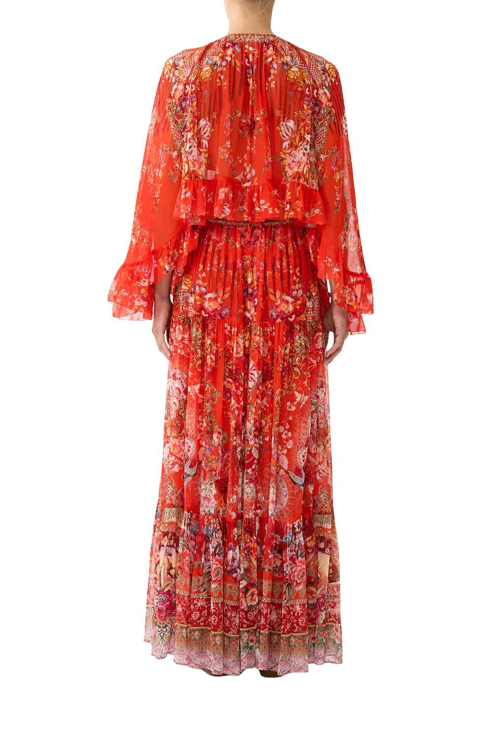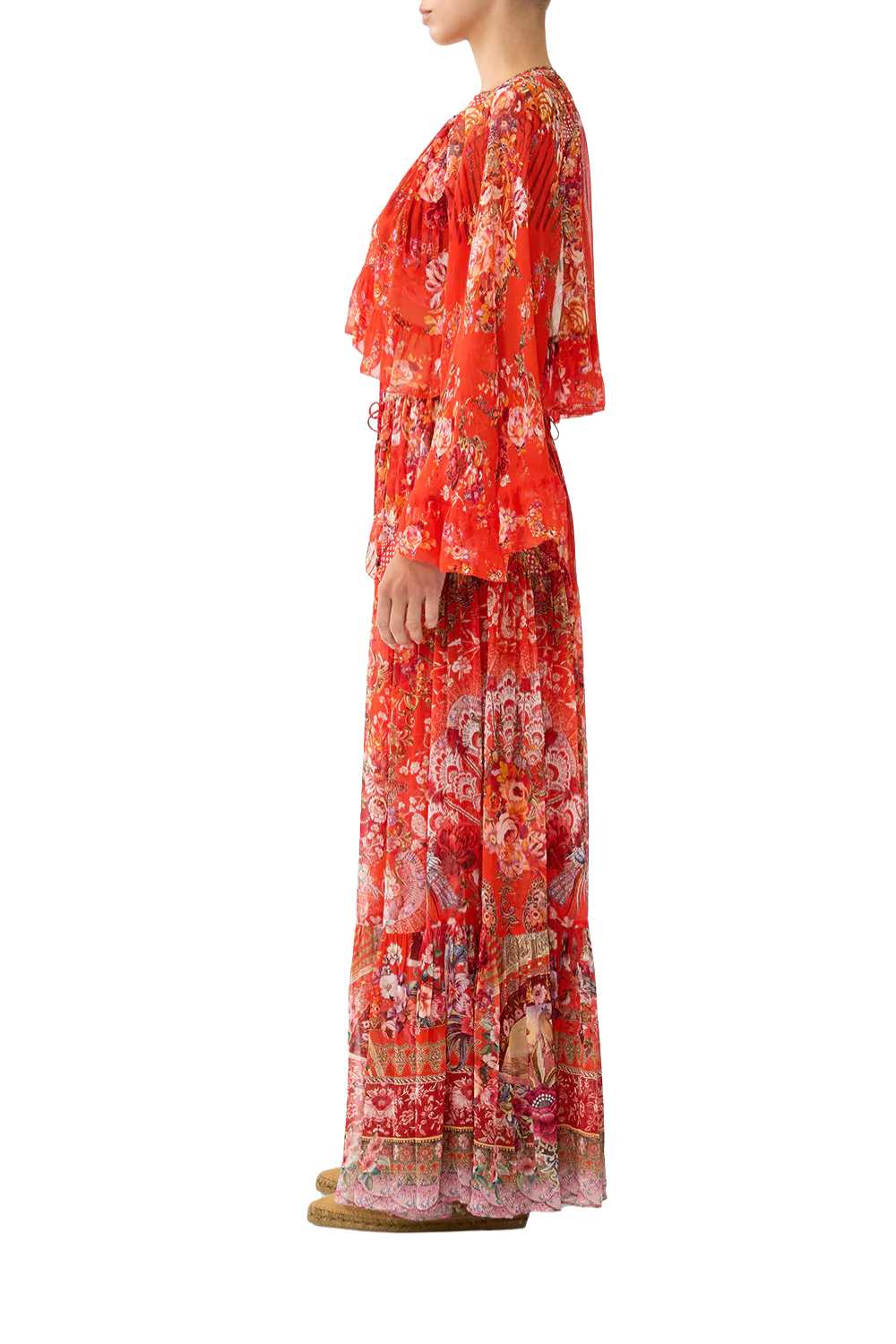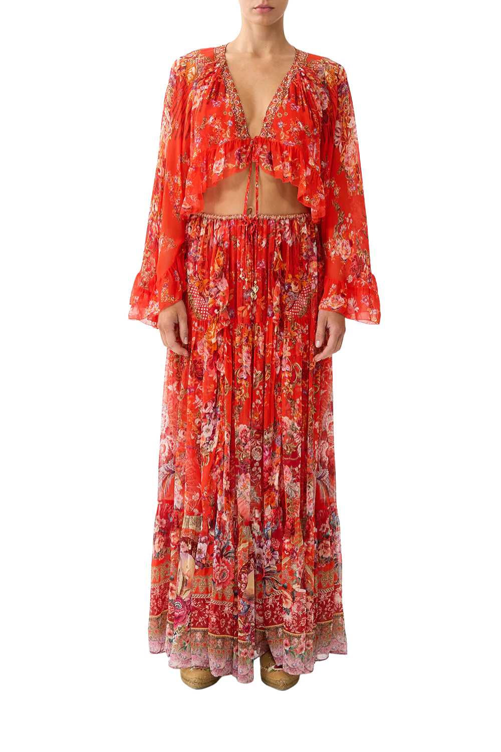 Camilla Olé Olé Tiered Skirt With Ruffle Detail is a handcrafted design by our in-house artisans, brought to life in an exclusive limited-edition print. Sitting high on the waist and falling to a flowing maxi hemline, it creates an effortlessly elongated silhouette. Tiered panels and soft ruffle accents add movement and texture, while adjustable waist ties finished with custom hardware allow for a perfectly tailored fit. Striking yet versatile, it’s designed to stand beautifully on its own for elevated everyday styling—or to make a bold statement when paired with its matching piece.