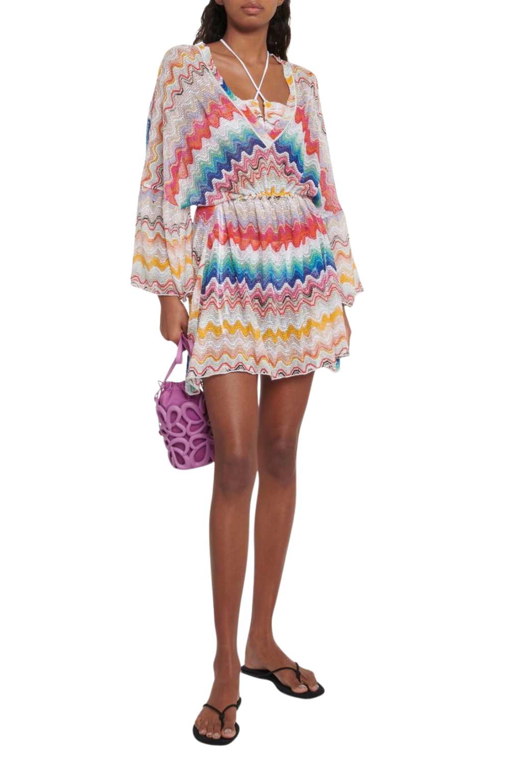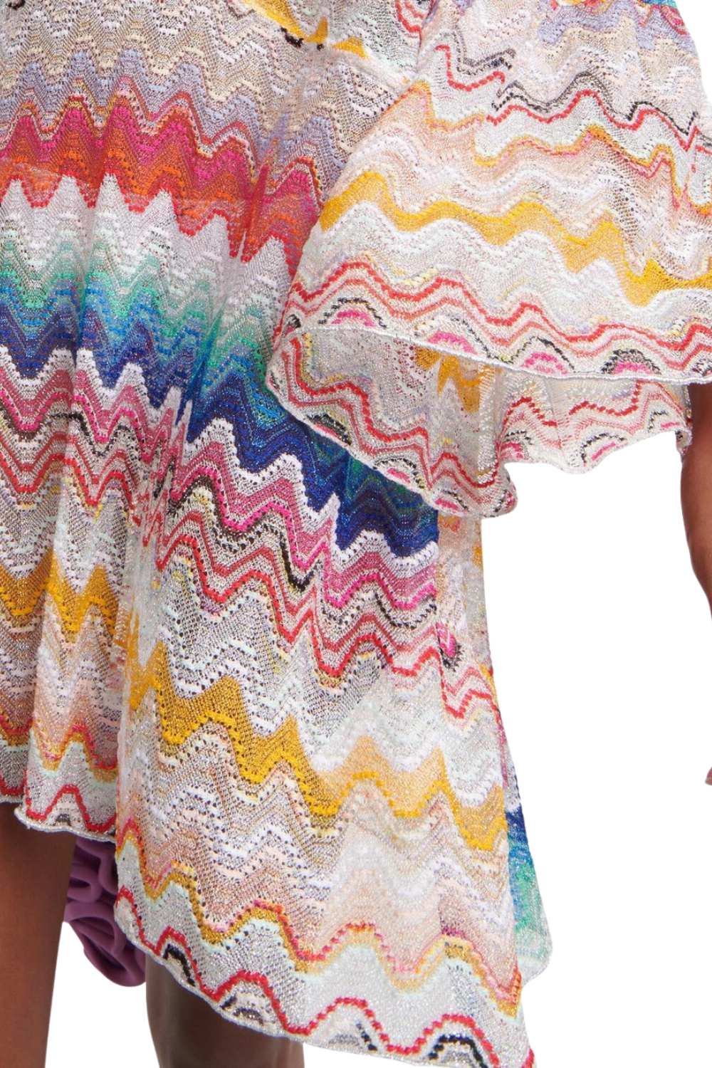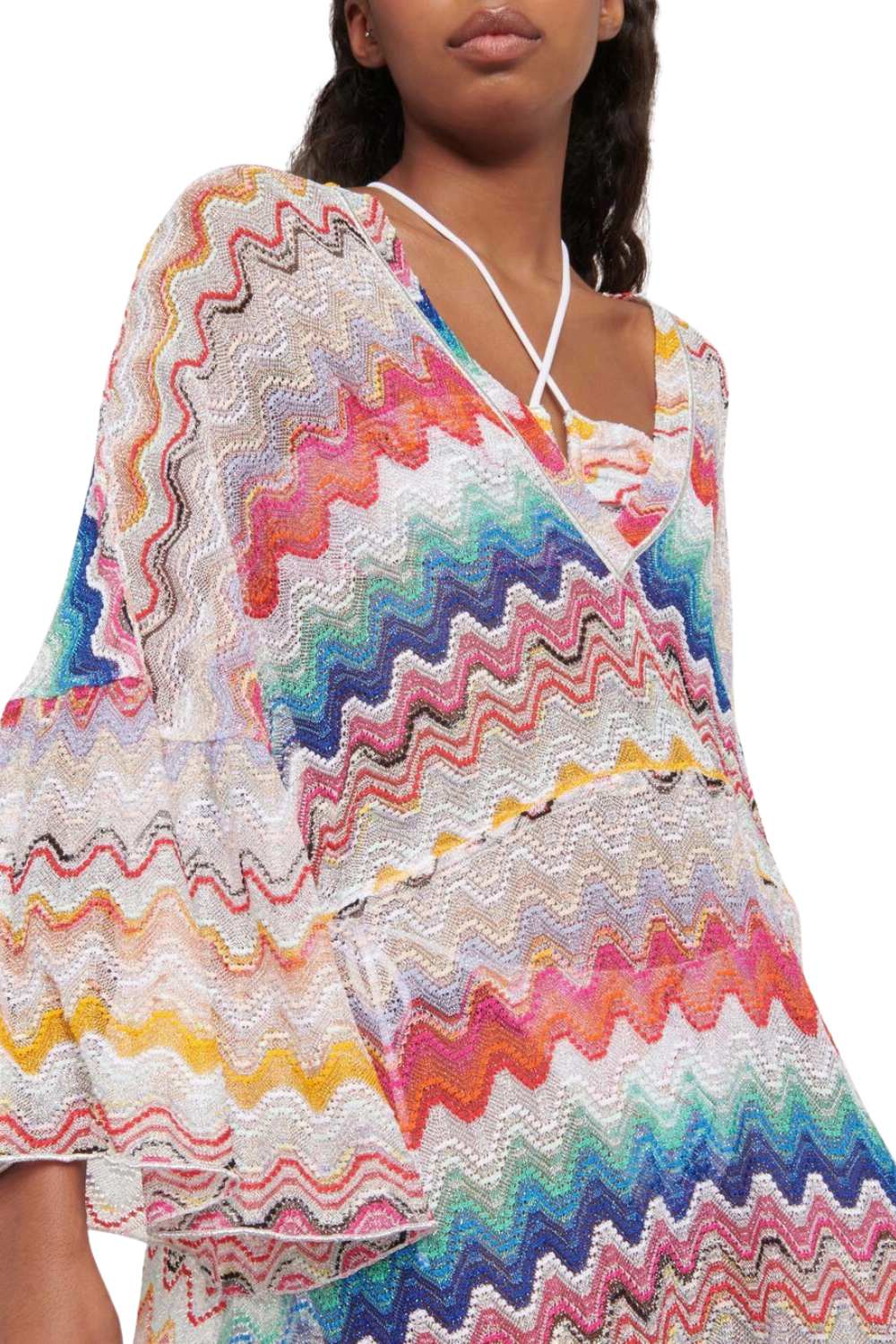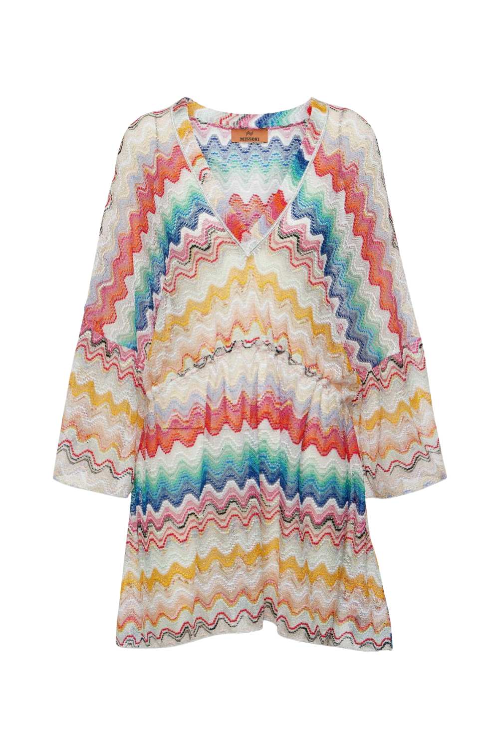 The Missoni Zigzag short cover-up kaftan is an effortless layer designed to shimmer softly in the sun. Crafted in Italy from a lightweight viscose blend woven with metallic fibers, the iconic multicolor pattern glows subtly against its white base.
