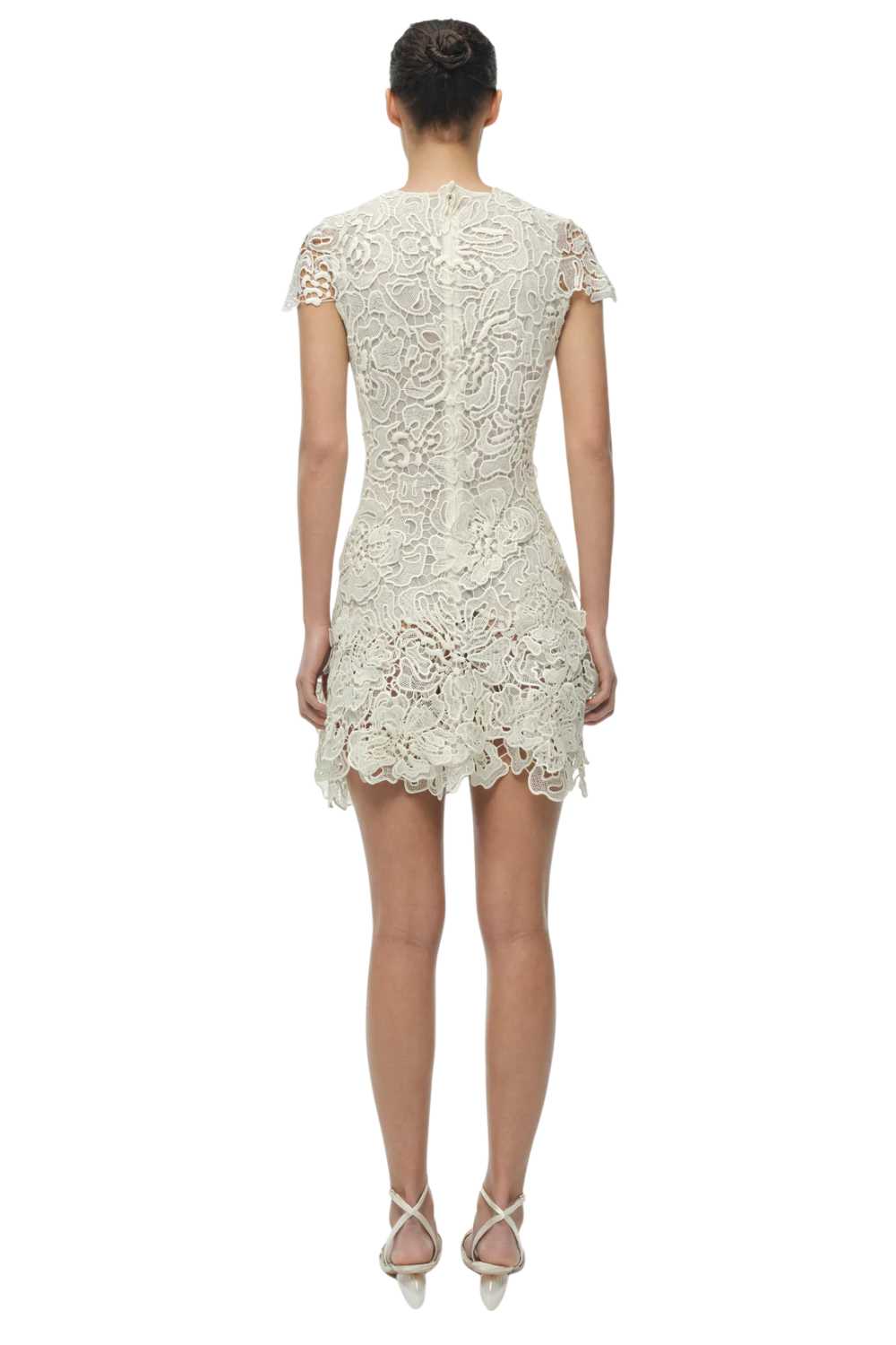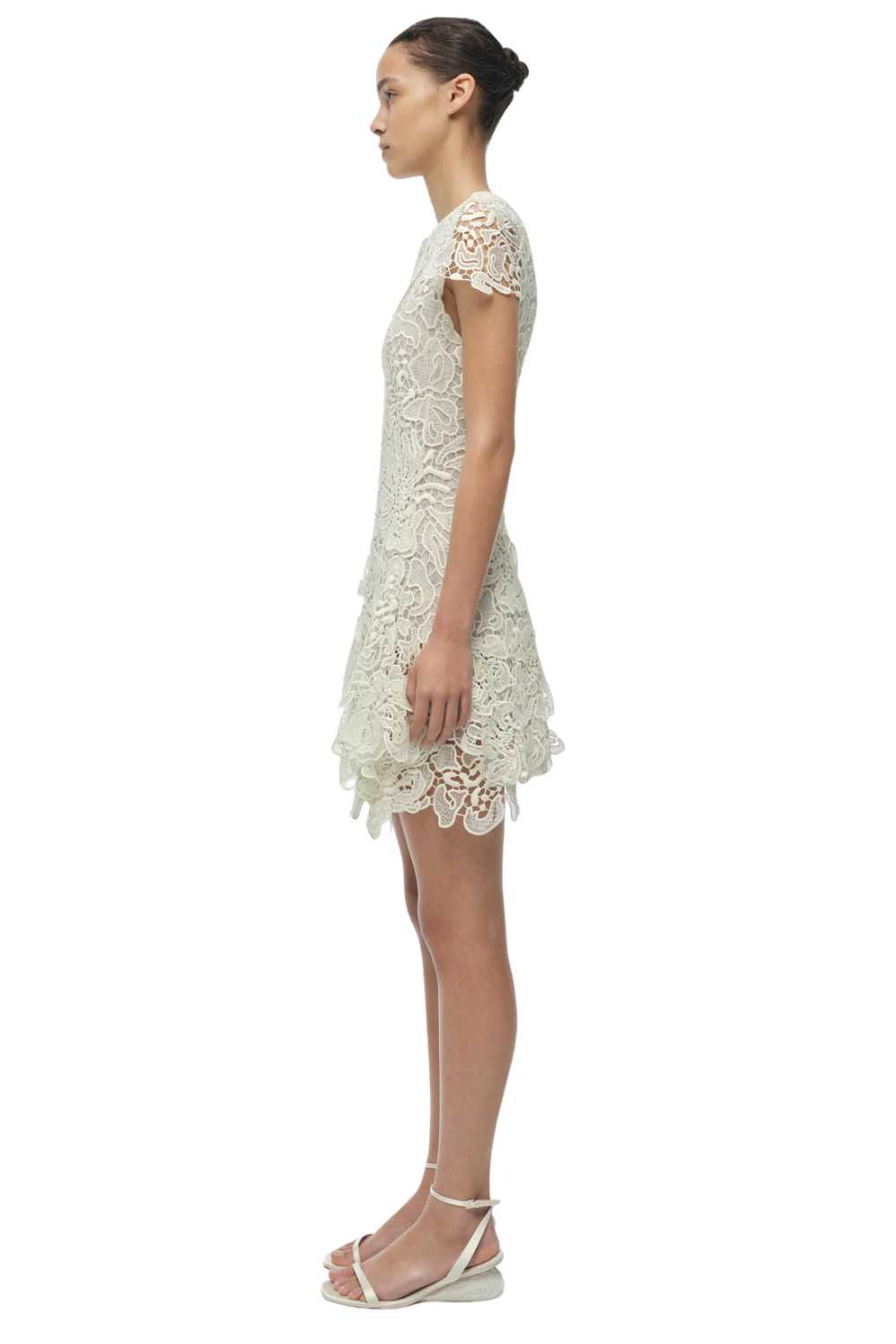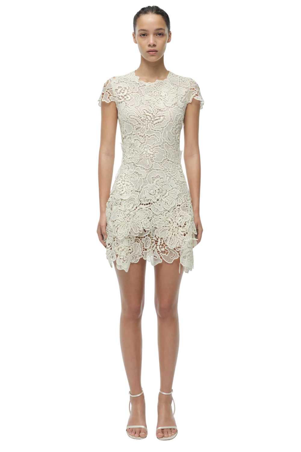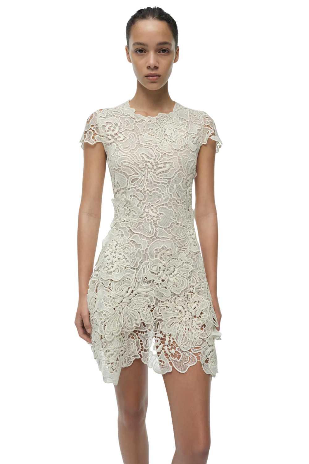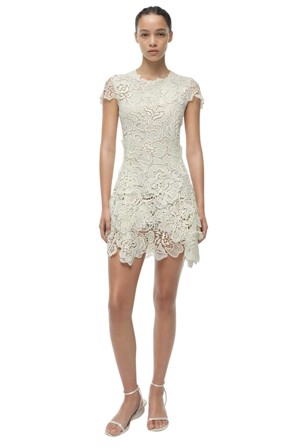 Lace mini dresses succeed or fail on the quality of the lace and the intelligence of the construction beneath it. The Novelle uses lace that has weight and structure — it doesn’t collapse under its own complexity — and the internal lining and support mean the dress wears without additional underwear. In white, the lace reads with the kind of graphic clarity that coloured versions sometimes obscure. The mini length sits above the knee; the silhouette is fitted through the bodice and releases slightly toward the hem. The Novelle is the dress for the first evening of a holiday — the one where you’ve just arrived, the light is perfect, and you want to feel as though you made an effort without having worked at it. Available S and M.