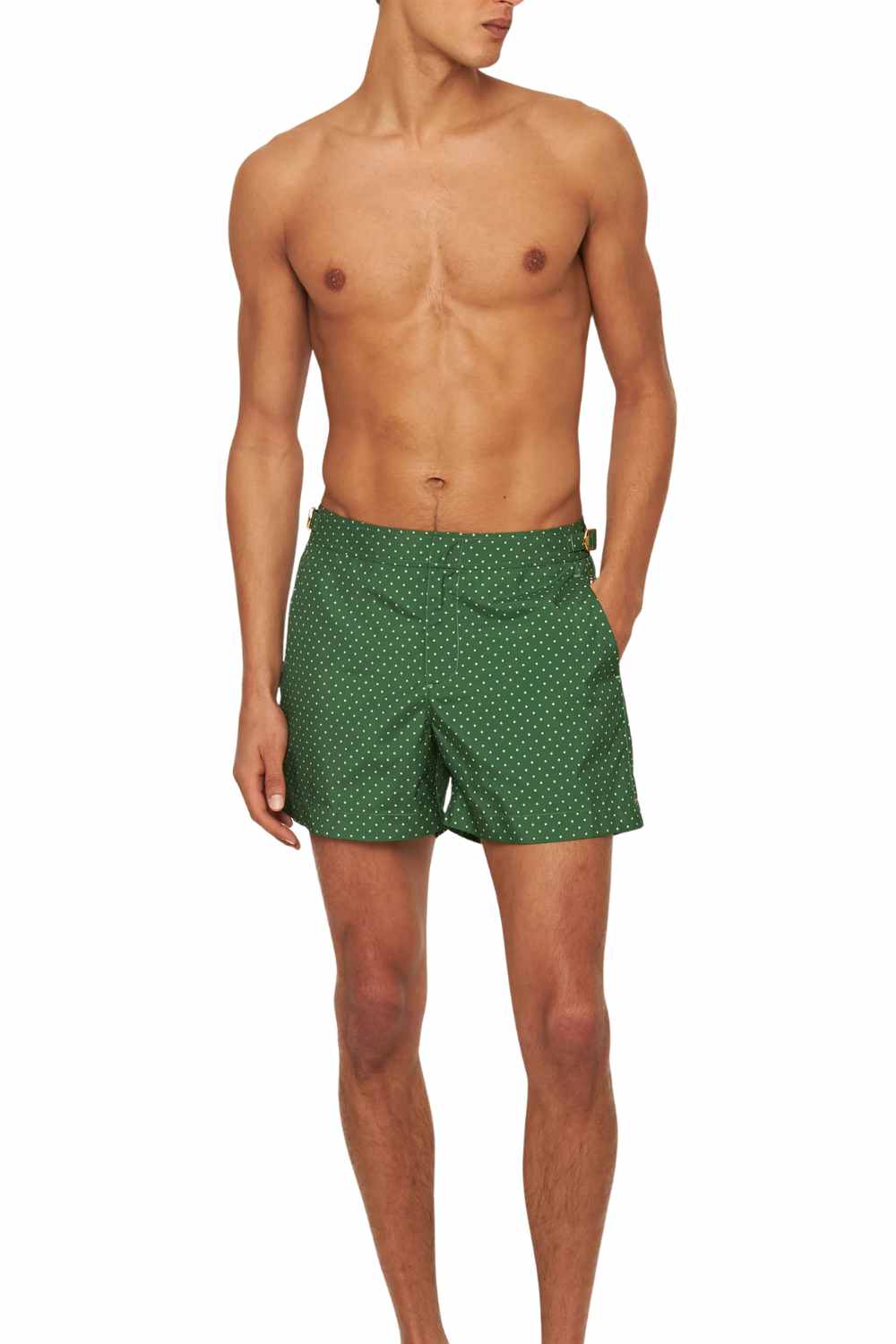 These shorts have all the signature Setter details: quick-drying fabric, less coverage, and adjustable side fasteners in an eye-catching gold effect. The Setter is slightly shorter than our original Bulldog swim shorts and features the same six key elements. Based on the pattern of a pair of men’s tailored trousers, these swim shorts are enhanced with signature adjustable side fasteners, providing a perfect fit time after time. Signature Setter fit Printed polyester, woven in Italy Exclusive print, designed in-house Adjustable branded gold-effect side fasteners Gold-effect concealed snap closure