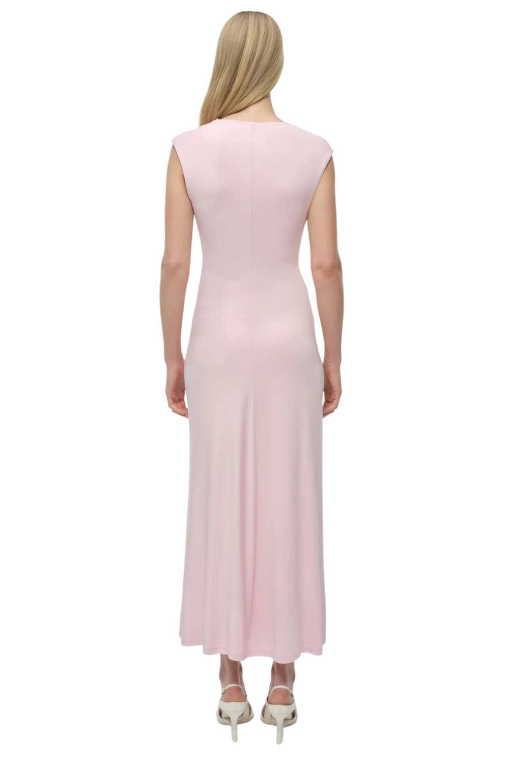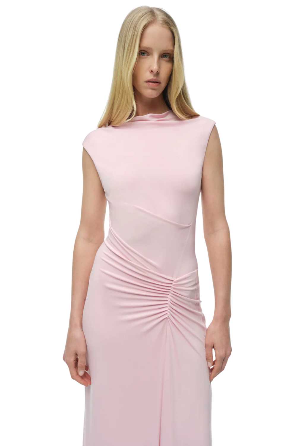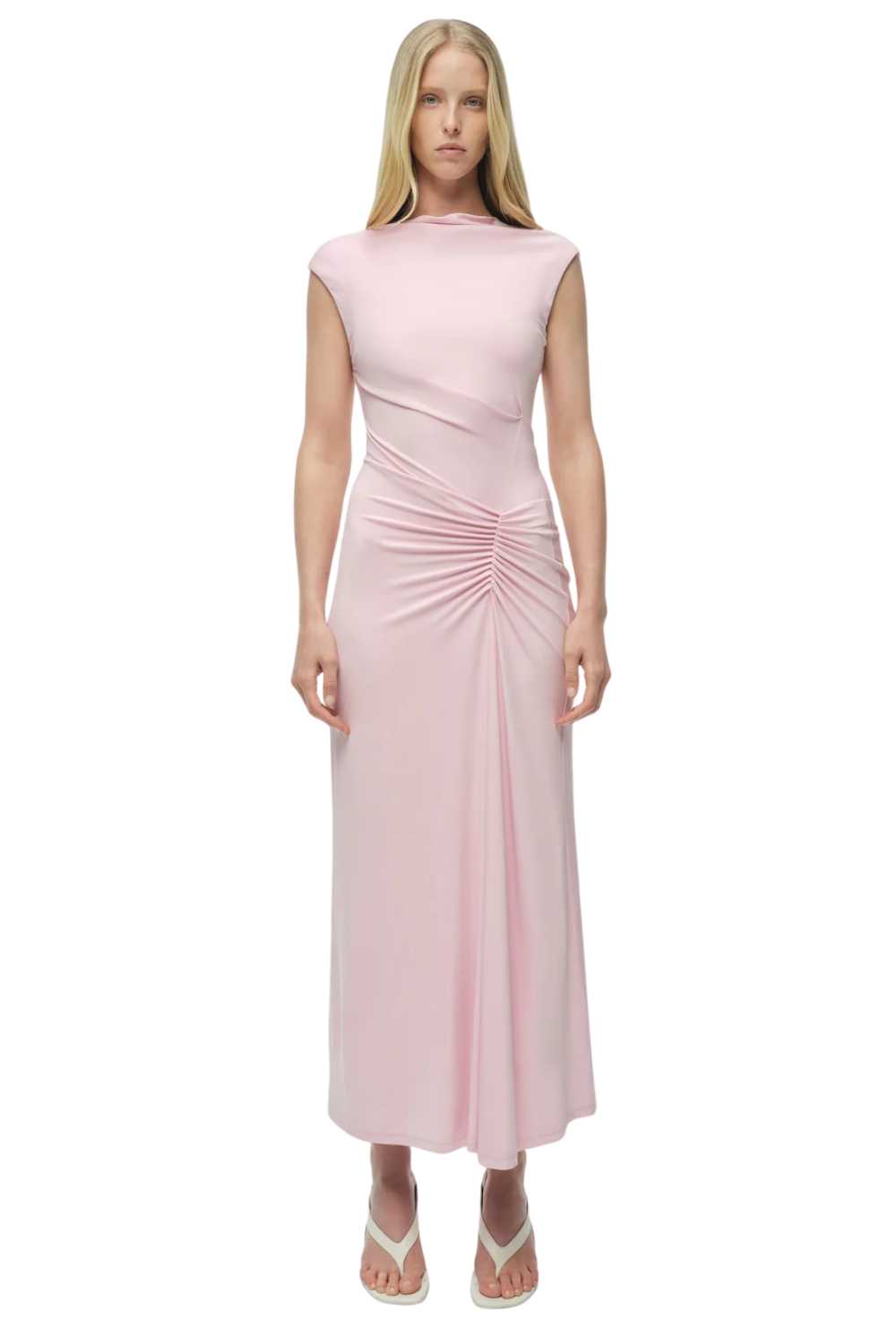 The Acacia Draped Jersey Midi Dress in Tulip brings the same engineered draping to a warmer, more playful colourway. Tulip — a warm coral-pink — is the colour that works in direct sunlight and against a tan, and in the jersey fabric’s slight sheen it reads as considered rather than candy-bright.