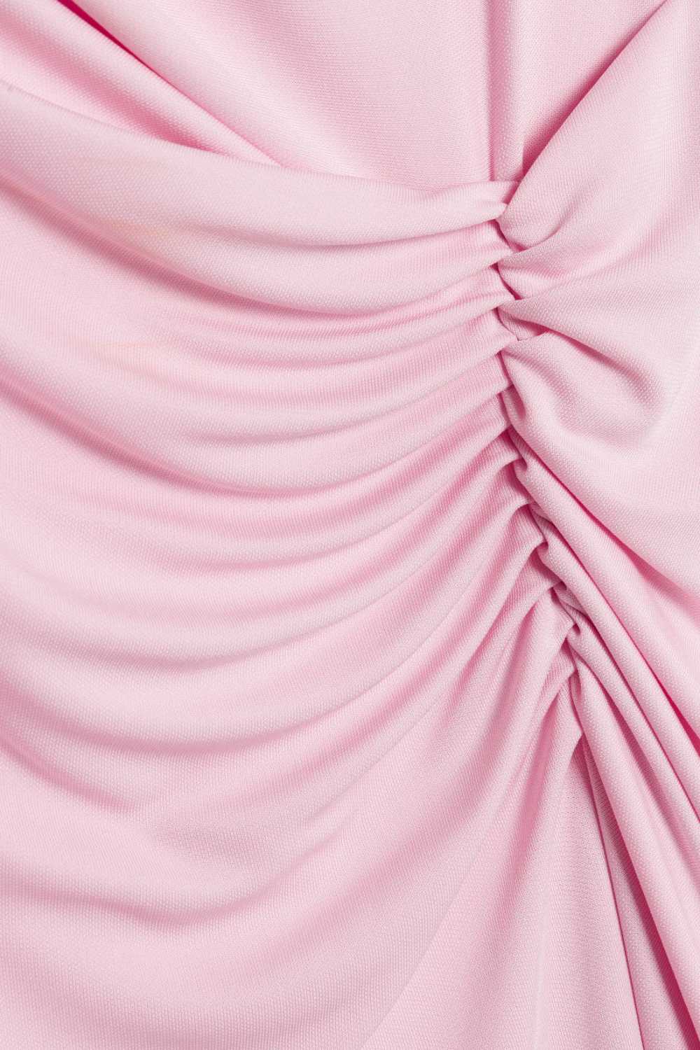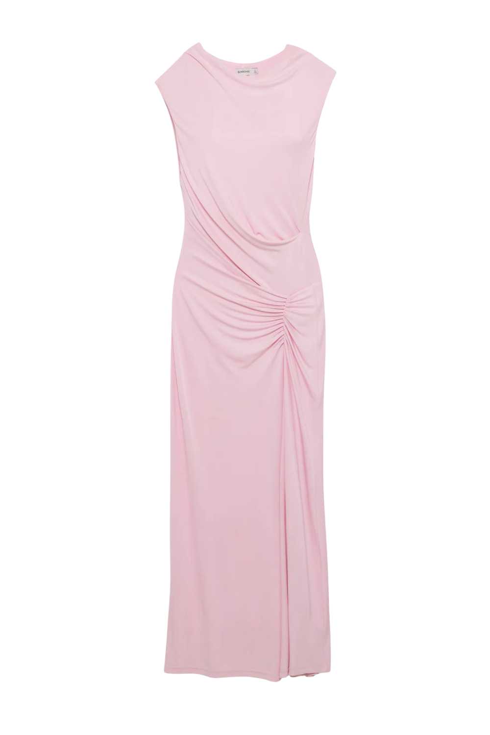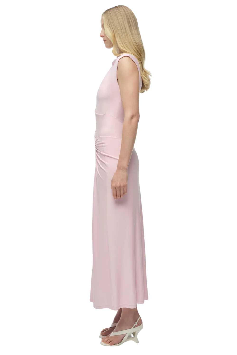 The Acacia Draped Jersey Midi Dress in Tulip brings the same engineered draping to a warmer, more playful colourway. Tulip — a warm coral-pink — is the colour that works in direct sunlight and against a tan, and in the jersey fabric’s slight sheen it reads as considered rather than candy-bright.