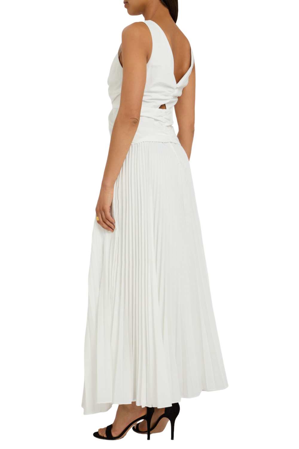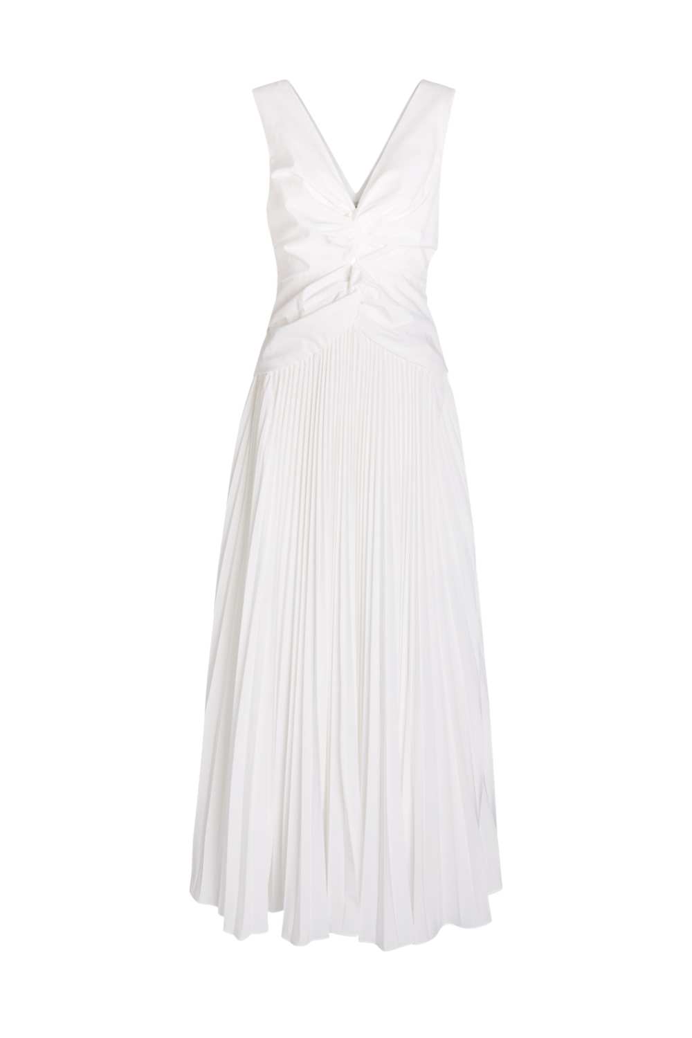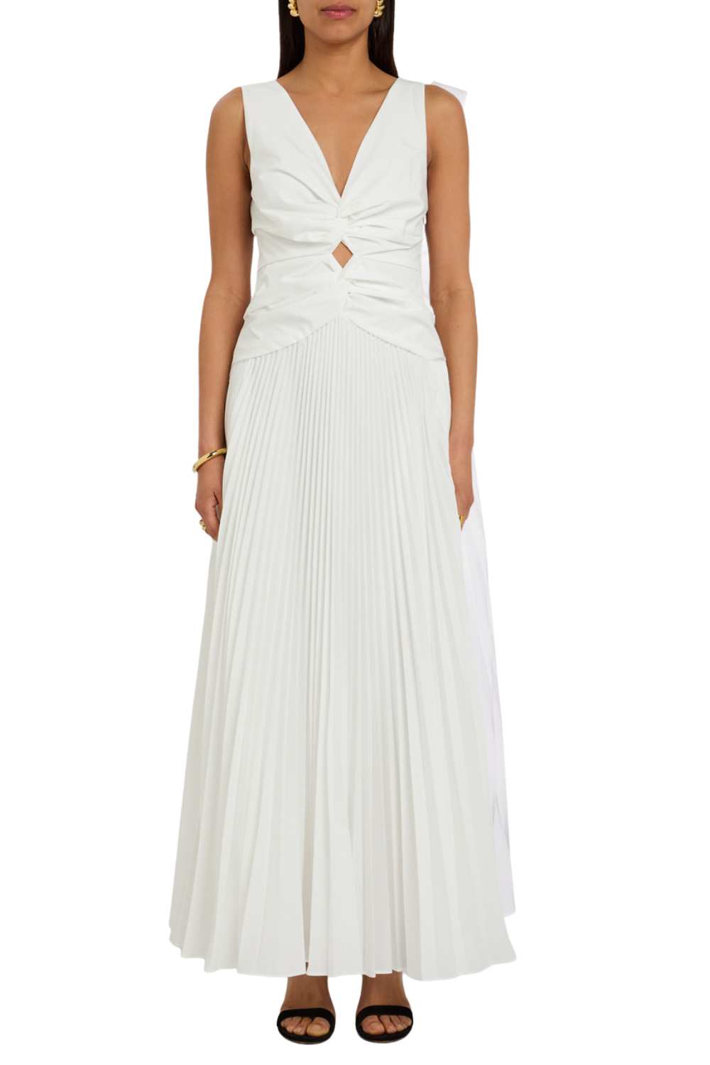 The Vivanne Midi Dress is Simkhai at their most architectural — the kind of white dress that has real construction behind it rather than relying on the colour to do the work. The silhouette is structured through the bodice and releases into a midi skirt with enough volume to move beautifully without requiring anything underneath. It’s the dress you pack when you know there will be a dinner worth dressing for.