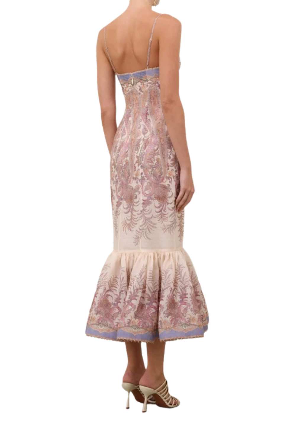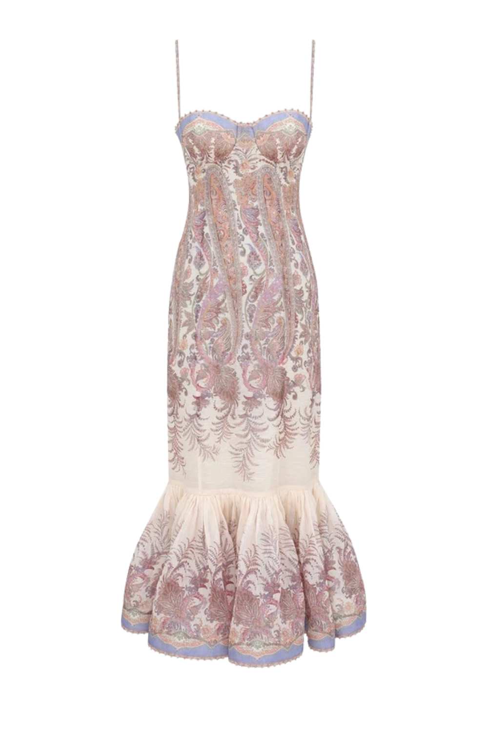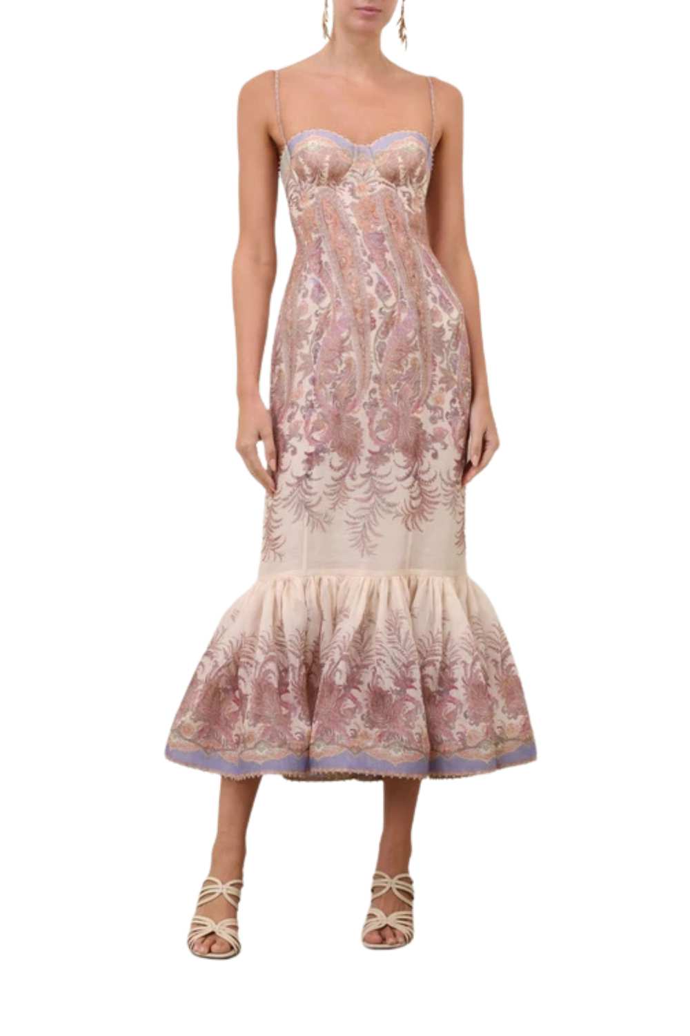 The Alchemy Gown in Cream Paisley from Zimmermann Spring 2026 Kindred Spirit Collection is a romantic midi dress crafted from a refined silk-linen blend. Designed with a flattering sweetheart neckline, it features moulded cups through the bodice for gentle structure and support.