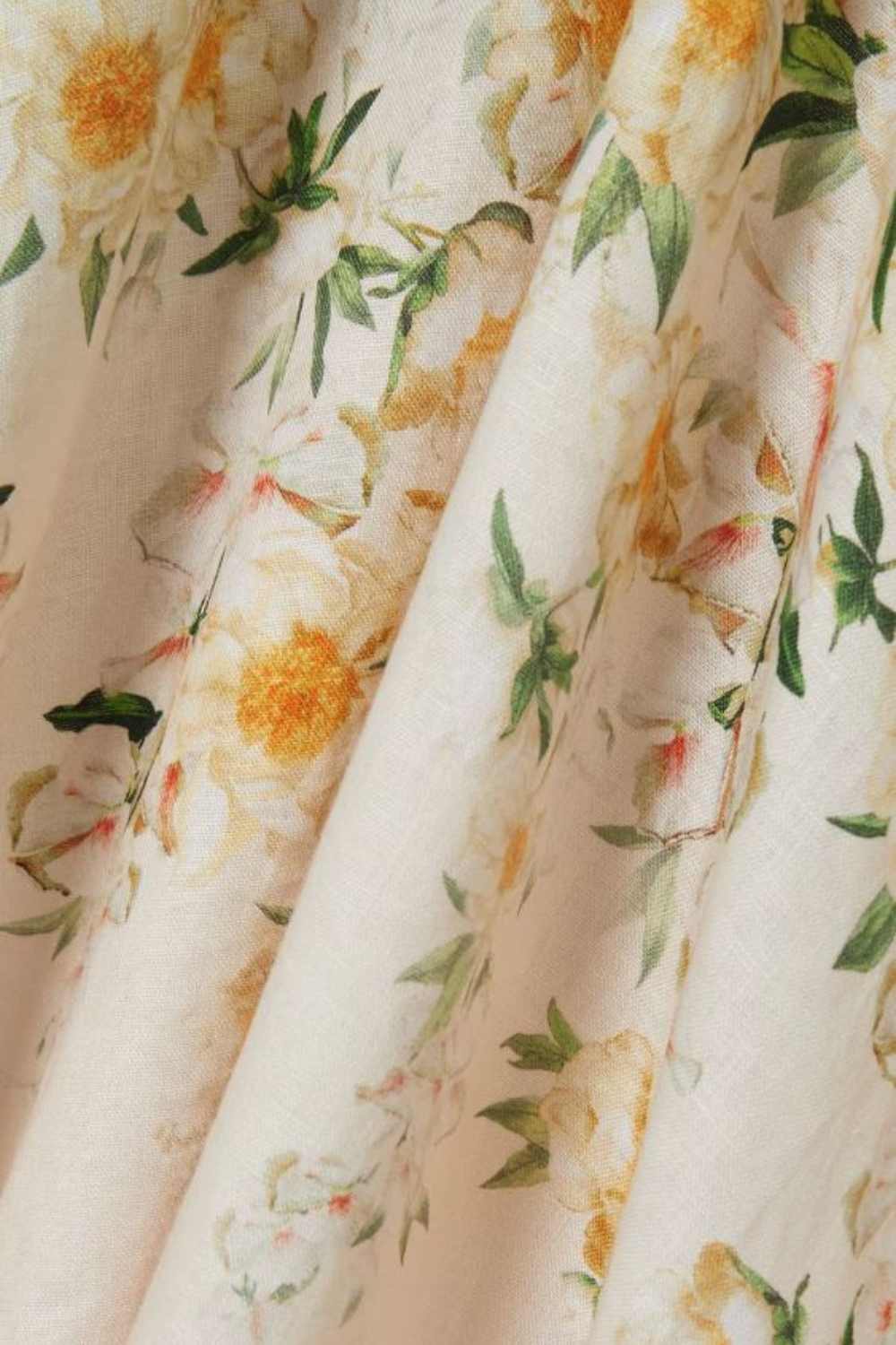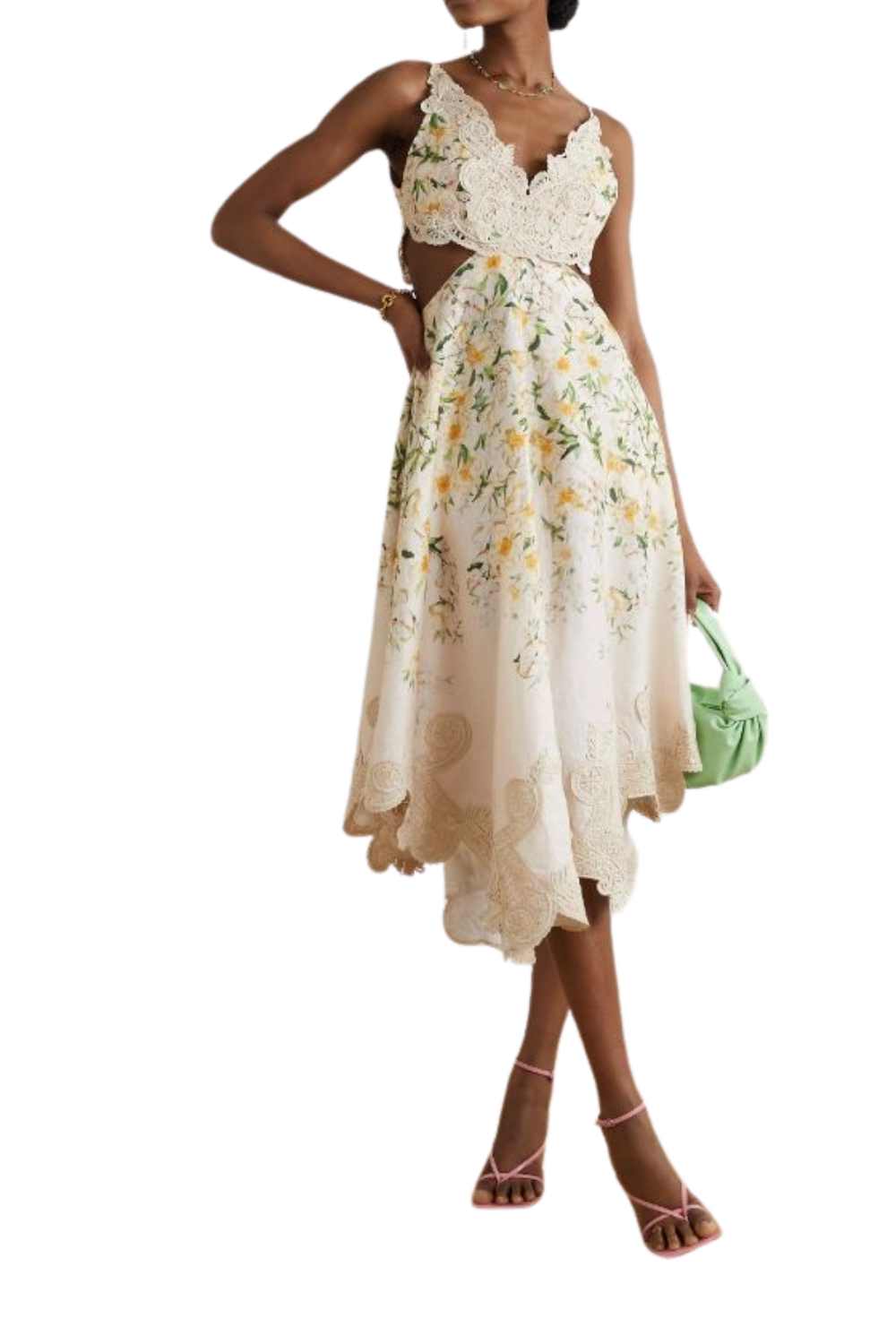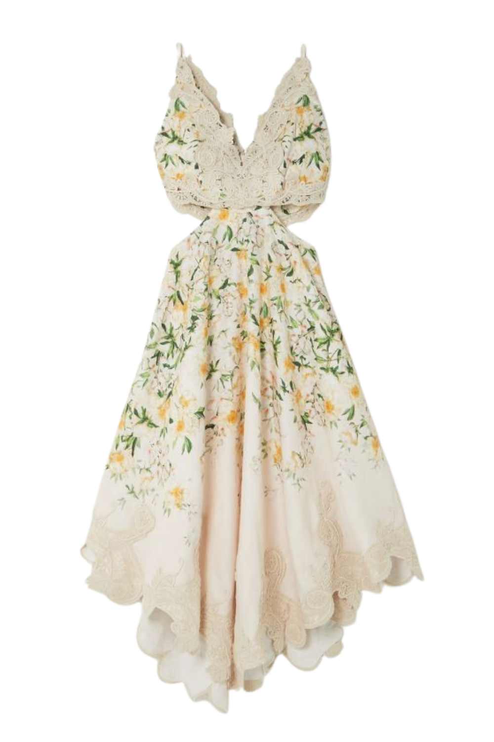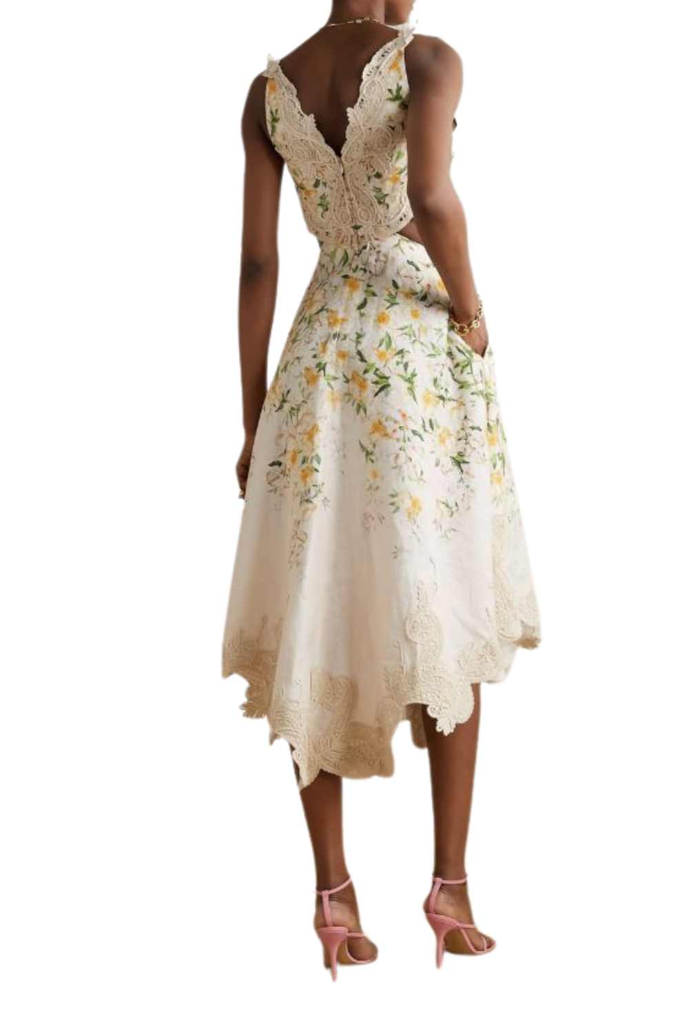A linen midi dress featuring a cutaway waist and Battenburg lace embroidery throughout. Linen midi dress Plunging V neckline Side seam pockets Adjustable straps Zip closure