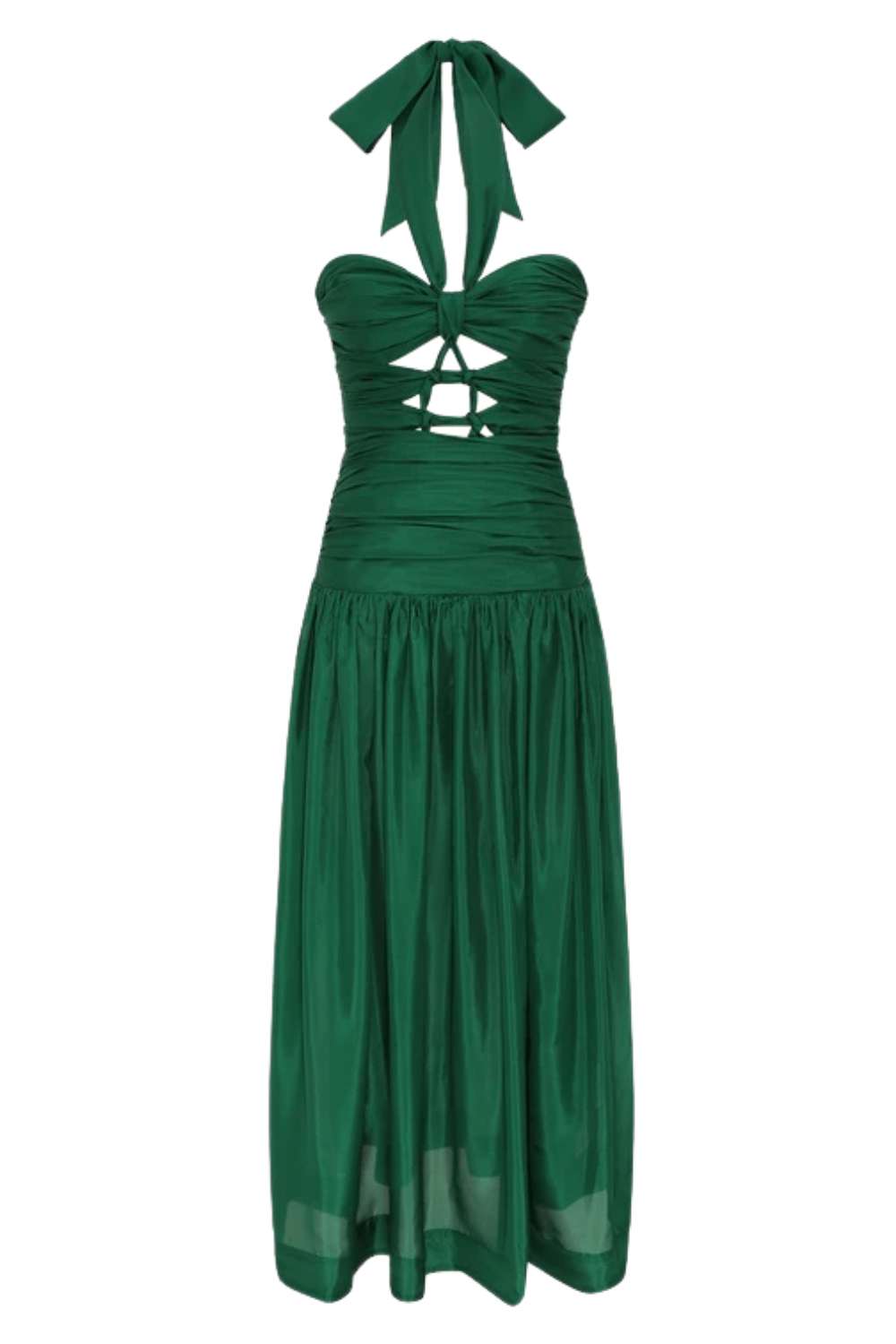 Radiant and refined, the Zimmermann Daylight Knot Midi Dress is crafted from lustrous silk in rich emerald tones. The halter neck tie frames the shoulders beautifully, while the fitted bodice is accented with the brand’s signature knot detail for an elegant focal point. From there, the silhouette flows into a softly pleated midi skirt that moves gracefully with every step. An invisible zip at the center back ensures a smooth, flawless fit..