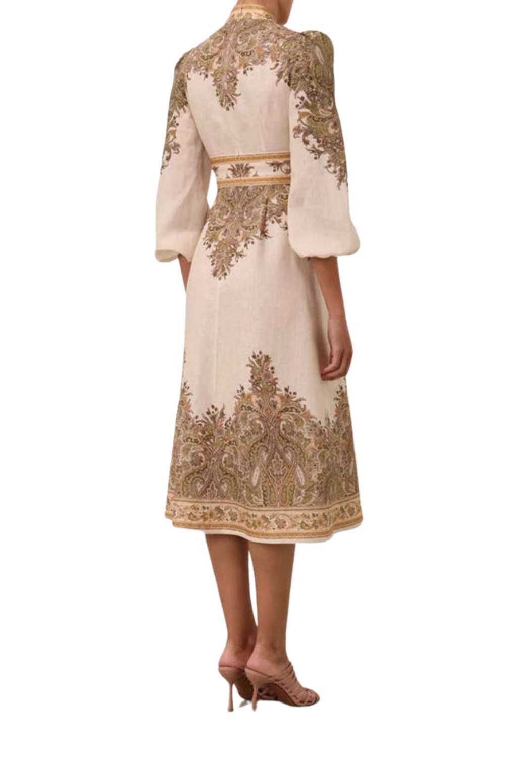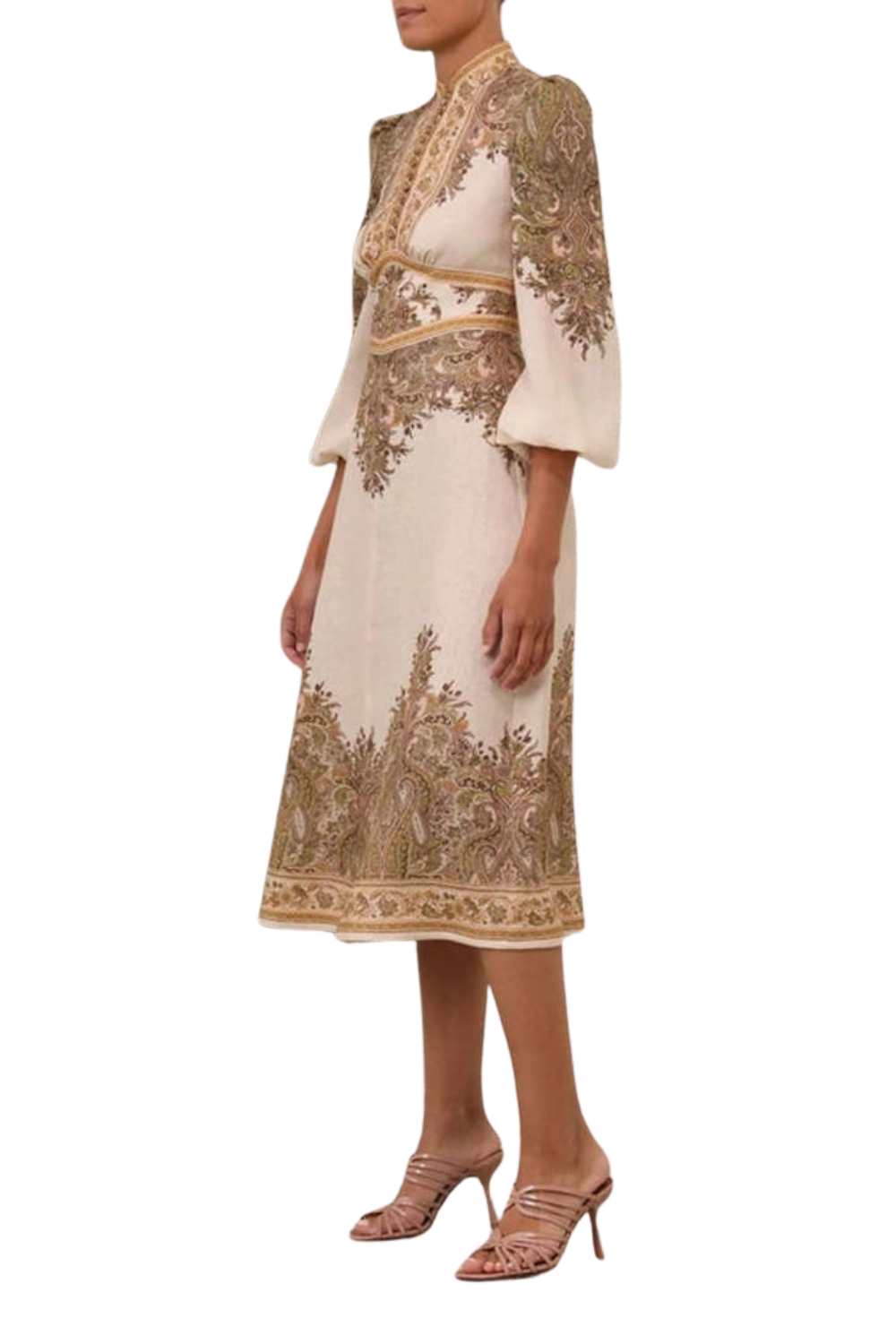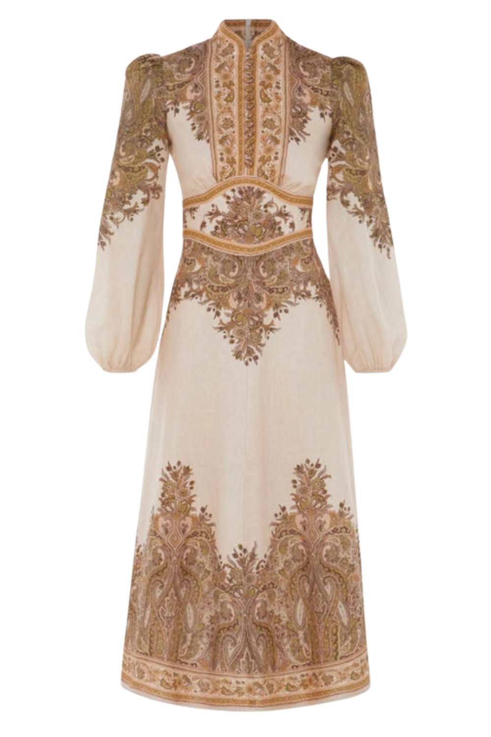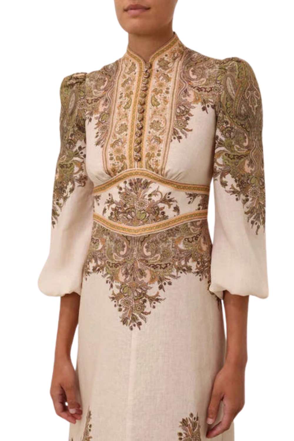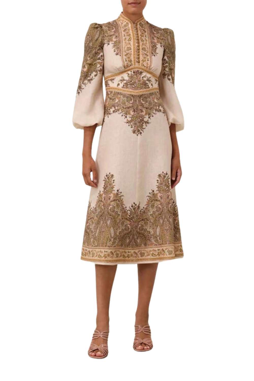 The Natura Buttoned Midi Dress in Khaki Paisley. A linen midi dress featuring a stand collar and exaggerated sleeves.