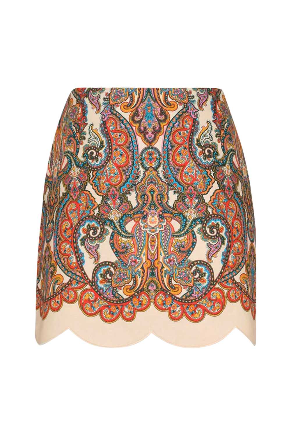 A flirty nod to bohemian luxe, Ottie Scallop Mini Skirt features high waist and intricate paisley pattern on breathable linen, blending vintage charm with modern silhouette. Perfect for sun-drenched escapes or elevated city strolls.