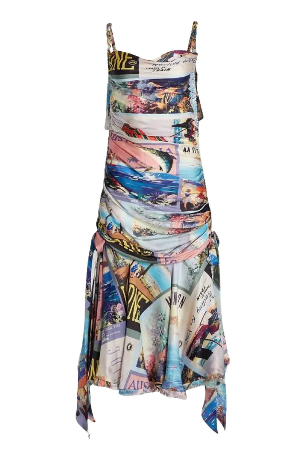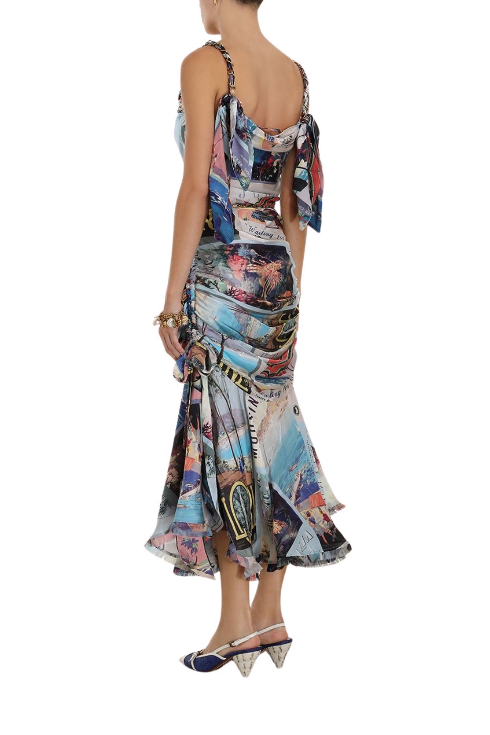 Postcard Chain Tie Midi Dress in Large Poster Print. Beachcomber Slingback in Navy, Hoop Bracelet in Golden Brass, Charm Chain Bracelet in Golden Brass, Scarf Tie Panama in Large Poster Print, Charm Chain Belt in Golden Brass.