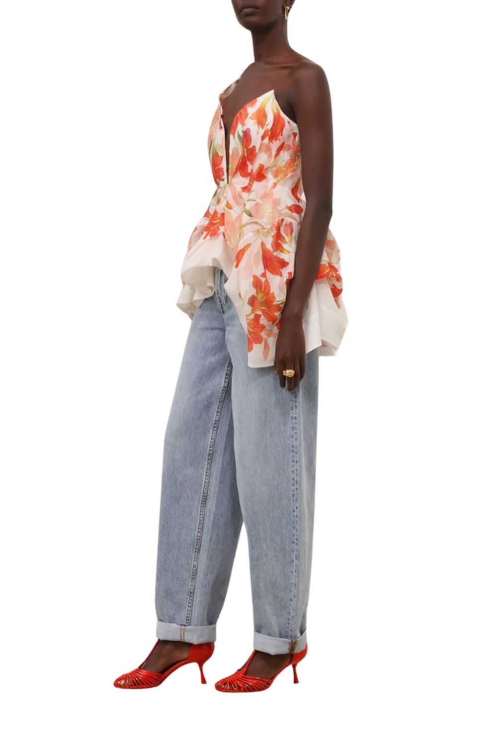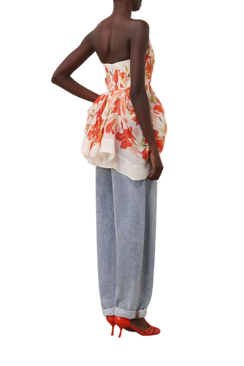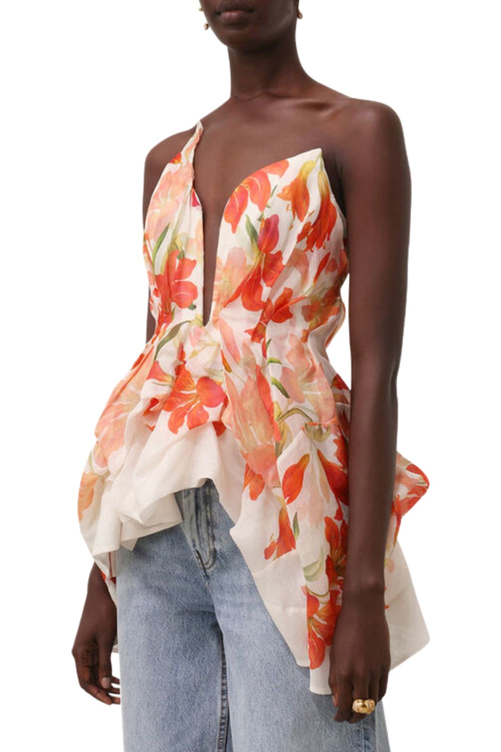 Zimmermann Tranquillity Draped Bodice is crafted in a luxurious silk-linen organza. Designed with a flattering strapless silhouette, it features a structured V-wire bust with internal boning for support, delicate frill detailing throughout, and a discreet invisible zip at the back with a hook-and-eye closure.